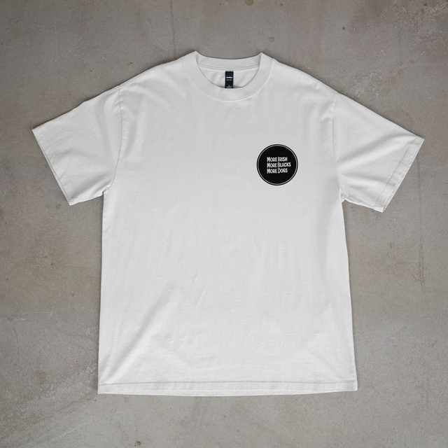 This tee is a response to posters that some London boarding houses put up in the 1950s stating 'No Irish, No Blacks, No Dogs'