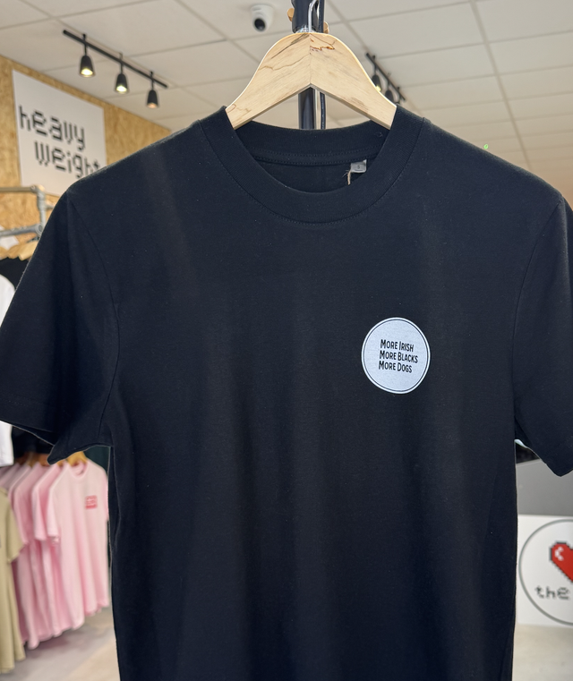 This tee is a response to posters that some London boarding houses put up in the 1950s stating ‘No Irish, No Blacks, No Dogs’.